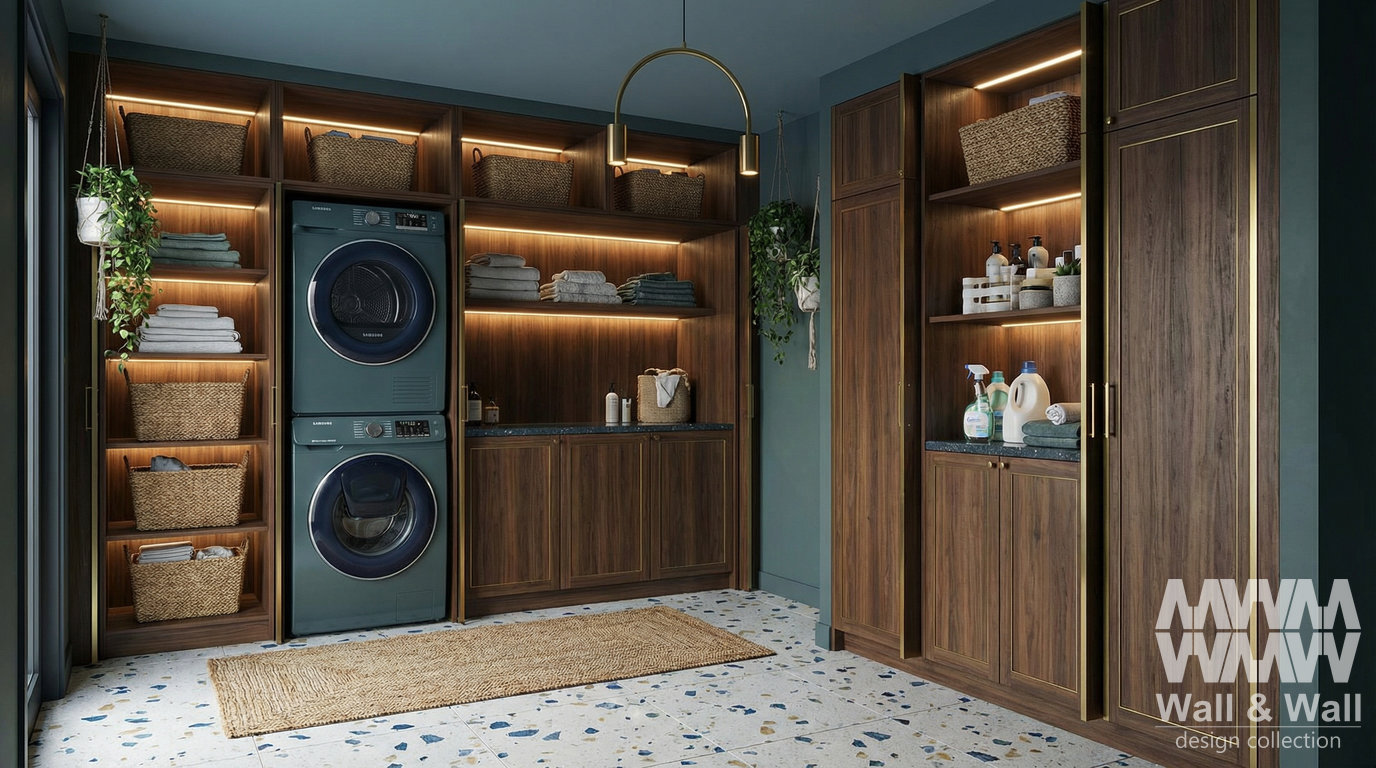 Уютная постирочная, где главное — шкафы во всю стену из тёплого дерева. Закрытые секции прячут всё лишнее, а открытые полки с мягкой подсветкой красиво показывают корзины и сложенные полотенца. Есть удобная столешница для сортировки белья и отдельное место для бытовой химии — всё на своих местах и всегда порядок.