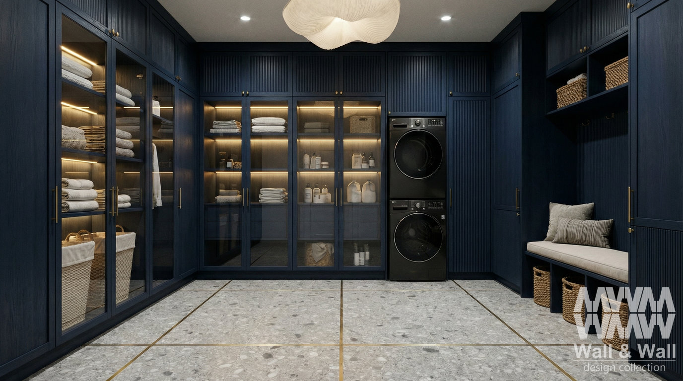 Стильная постирочная с шкафами во всю стену в глубоком синем цвете. Закрытые секции прячут всё лишнее, а шкафы со стеклом и подсветкой красиво показывают полотенца и средства для ухода. Есть отдельные полки и удобная лавка с корзинами — всё под рукой и всегда порядок. Стиральная и сушильная машины аккуратно стоят в одной нише и не выбиваются из общего вида.