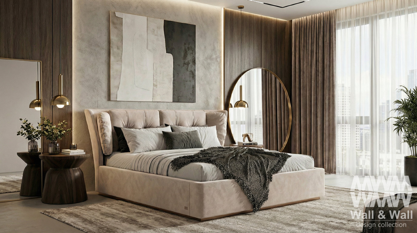 Спальня в стиле современного люкса: тёплое дерево и фактурная светлая стена создают спокойный фон, а мягкая кровать в бежевом велюре добавляет уюта. Латунные подвесные светильники и большое круглое зеркало дают красивый акцент и глубину. Панорамные окна с плотными шторами, нейтральная палитра и многослойный текстиль — идеальная атмосфера для отдыха.