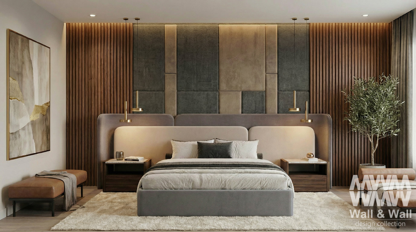 Спальня в стиле современного минимализма с ноткой люкса: акцентная стена из деревянных реек и мягких панелей в глубоких графитово‑бежевых оттенках задаёт ритм и уют. Тёплая подсветка и латунные подвесы создают камерное настроение, а мягкая кровать и пушистый ковёр добавляют ощущения «отеля». Натуральное дерево, спокойная палитра и зелень — идеальный баланс комфорта и эстетики.