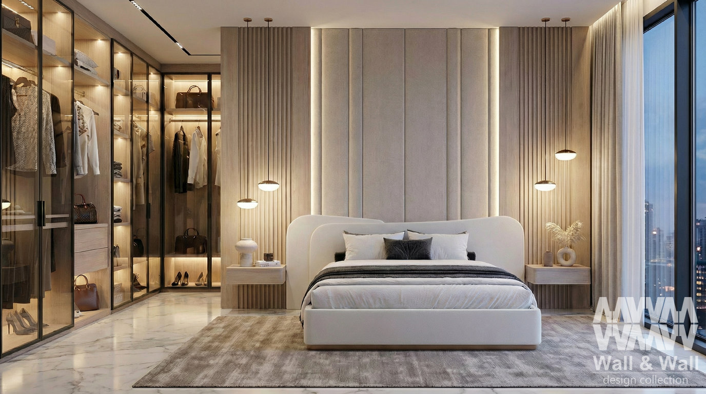 Спальня в стиле современного люкса: мягкая кровать с округлым изголовьем, тёплые деревянные рейки и вертикальные панели создают уютный ритм. Подсветка и лаконичные подвесы дают атмосферный вечерний свет, а гардеробная со стеклянными фасадами выглядит как бутик‑витрина. Нейтральная палитра, мраморный пол и большой ковёр — чистая эстетика и комфорт.