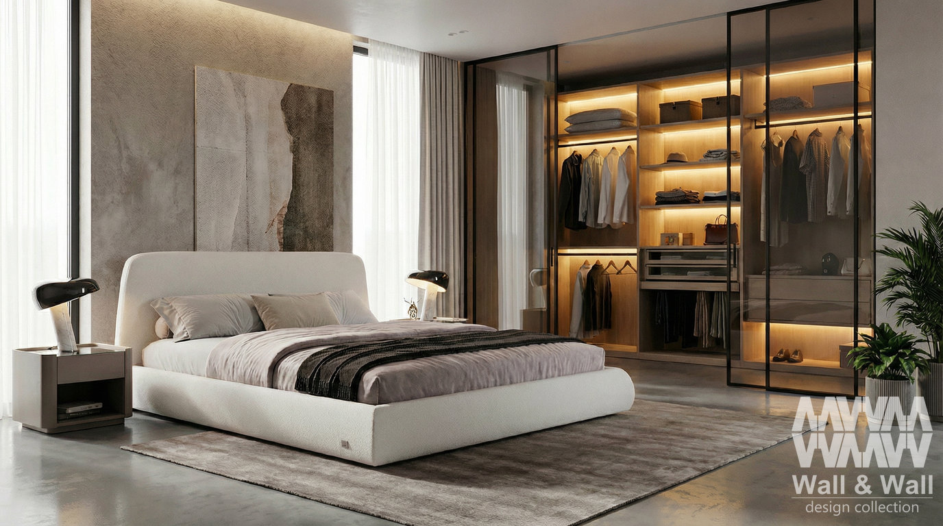 Вес на место: до Спальня в стиле современного минимализма с атмосферой отеля: мягкая кровать в молочной обивке, спокойная серо‑бежевая палитра и крупное абстрактное панно создают ощущение тишины и уюта. Панорамные окна наполняют комнату светом, а стеклянная гардеробная с тёплой подсветкой добавляет глубины и лёгкого люкса. Лаконичные тумбы, мягкий ковёр и зелень — идеальный баланс функциональности и эстетики. кг