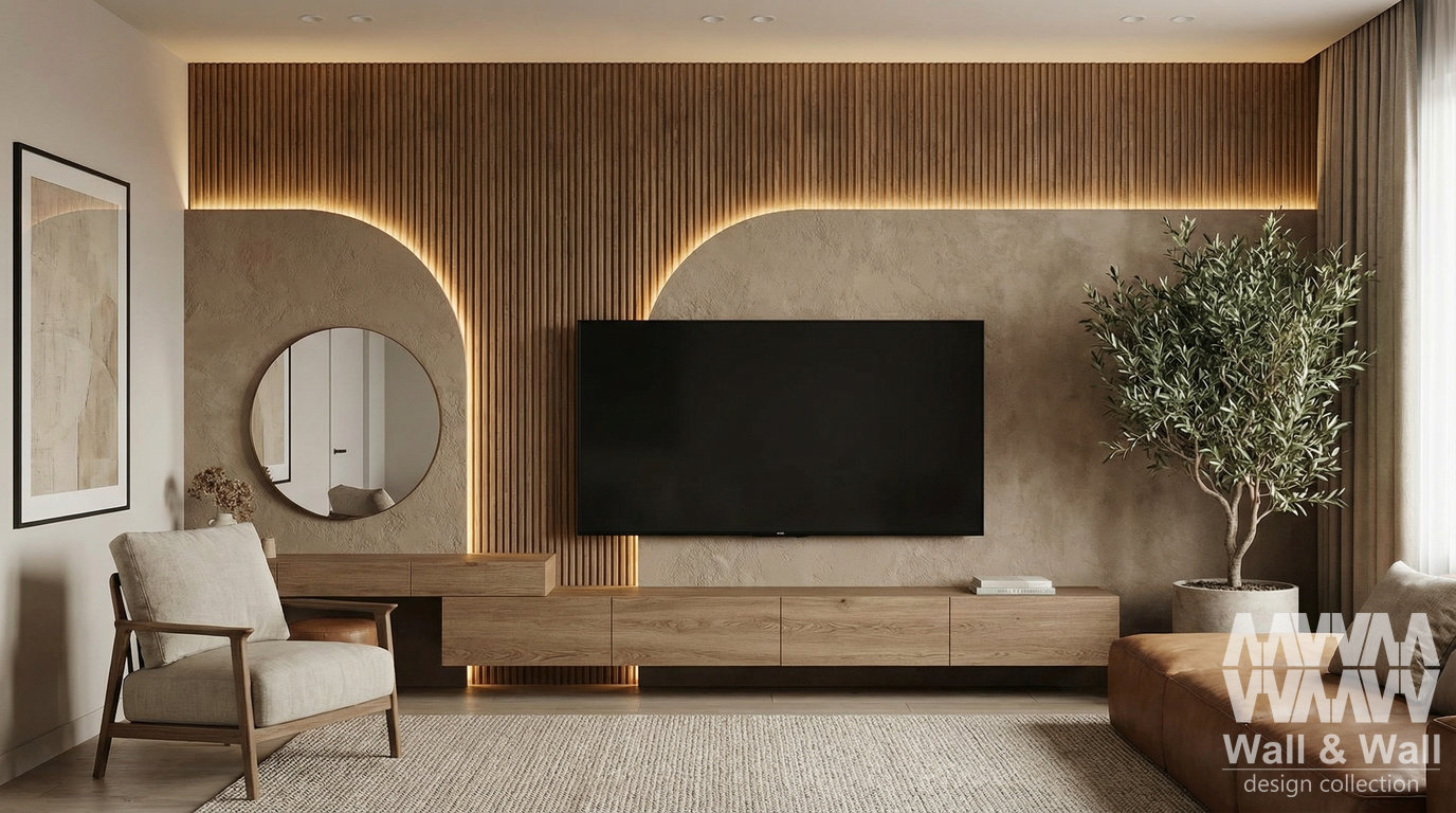 Стильная ТВ‑зона в духе тёплого минимализма: деревянные рейки и фактурная штукатурка создают уютный фон, а мягкая скрытая подсветка красиво подчёркивает геометрию арок. Подвесная тумба «парит» в воздухе и держит пространство лёгким, круглая зеркальная вставка добавляет глубины. Натуральные оттенки, текстиль и оливковое дерево — идеальный спокойный lounge для вечеров дома.